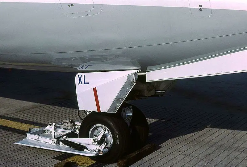 Žvyro defletktorius ant priekinio Boeing 737-200 rato. (Michel Gilliand, Wikimedia(GFDL 1.2)