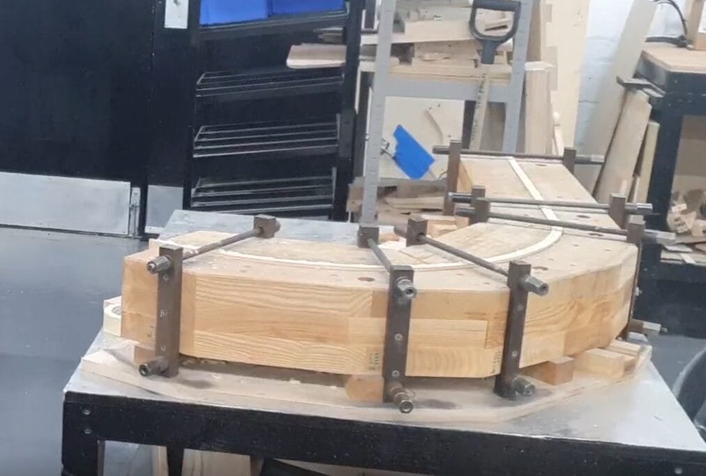 Formoje džiūstanti lenktos laminacijos detalė. Iš jos bus formuojamas sparnas